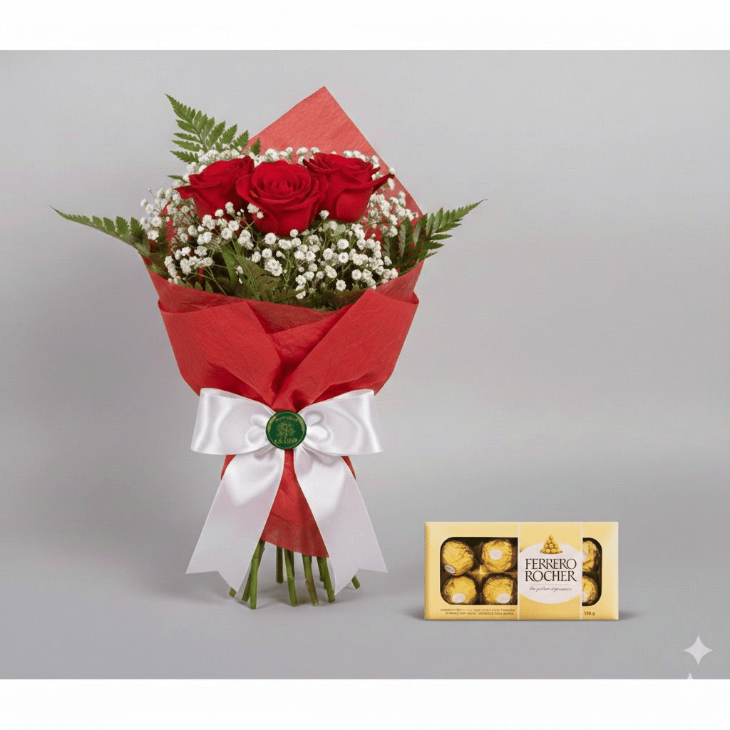 Mini Ramalhete de 3 Rosas e Ferrero Rocher.